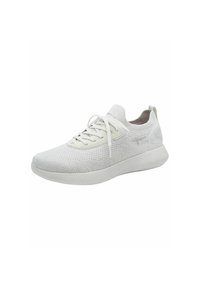 Baskets blanches légères avec une tige en mesh, des lacets plats, un col rembourré, une semelle lisse et des motifs de texture subtils sur l'ensemble du design.