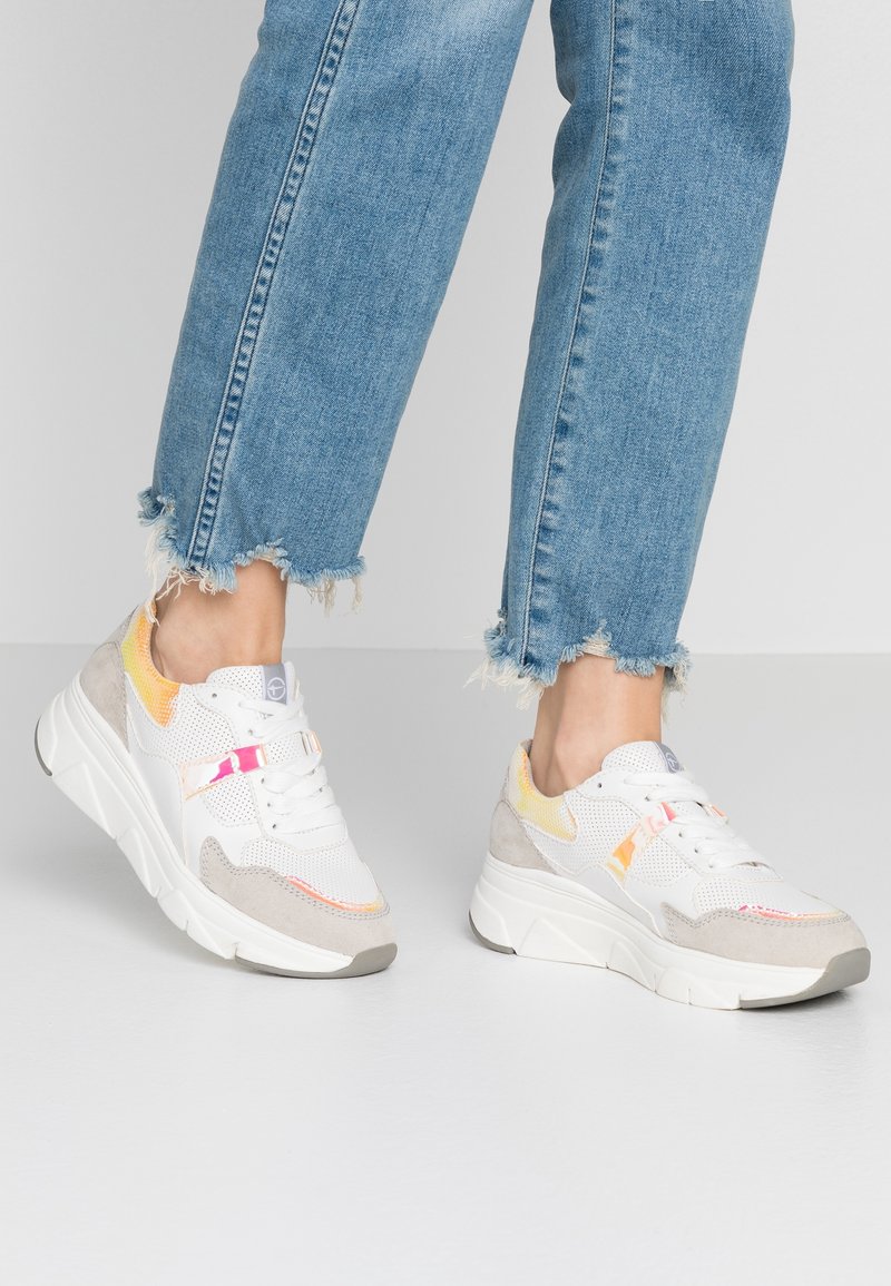 Baskets blanches et grises avec des accents colorés, matériaux en mesh et daim, semelle épaisse et détails perforés, portées avec un jean en denim effiloché.