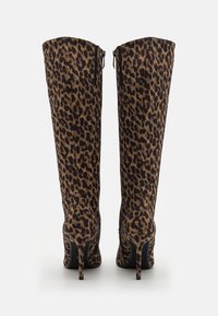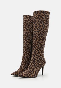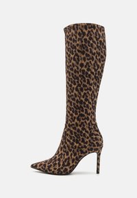 Botte stiletto à bout pointu montant jusqu'au genou avec un motif léopard marron et noir sur un matériau en suède.