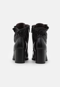 Bottines noires en cuir avec un embout arrondi, des lacets et un détail froncé au niveau de la cheville. Elles disposent d'un large talon bloc.