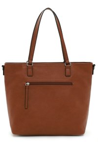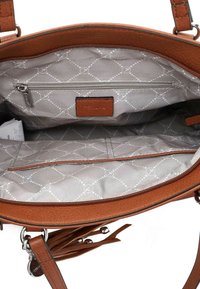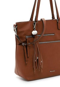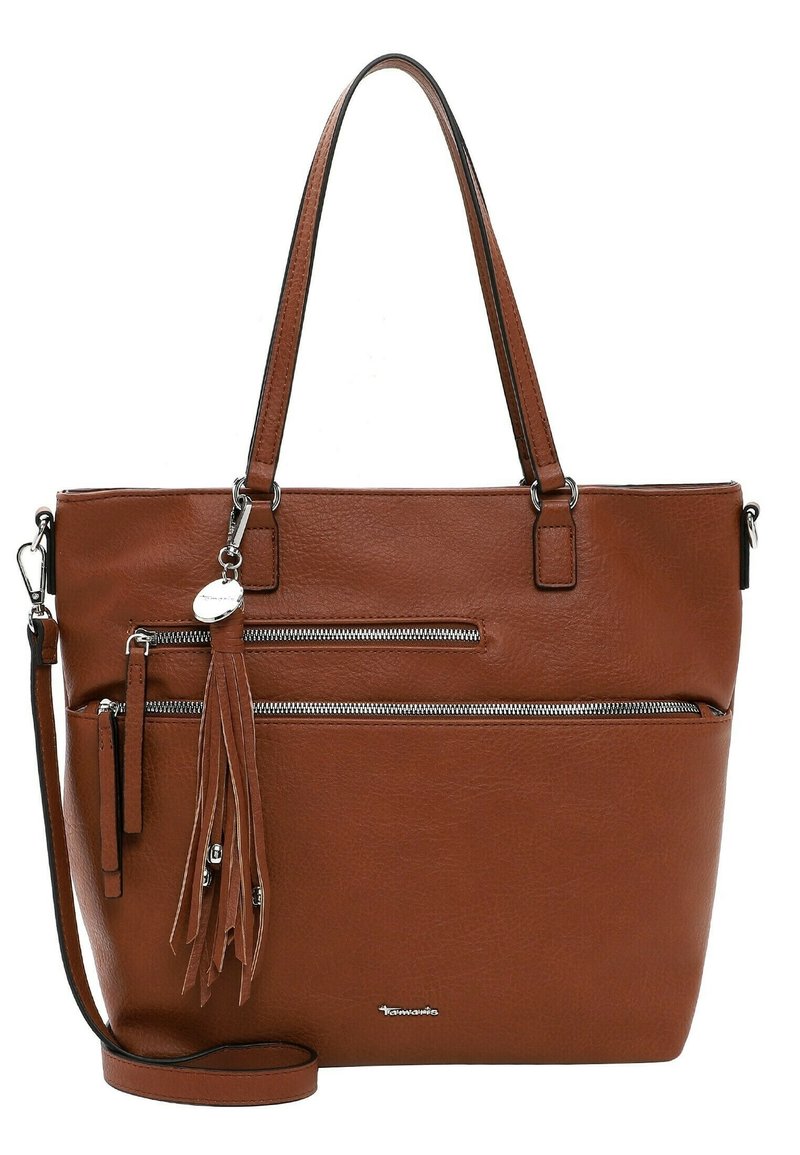 Sac cabas en cuir marron avec double poignées, plusieurs poches zippées, pendentif à pompon et bandoulière amovible.