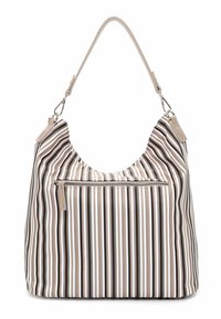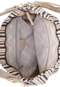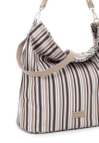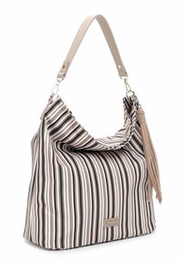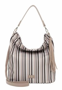 Sac à main rayé avec tissu doux en marron, crème et taupe. Présente un haut courbé, une longue bandoulière et un détail de pompon décoratif.