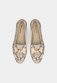 Loafers plats avec un motif serpent beige et marron, arborant un gland décoratif et une finition en cuir lisse sur un petit talon en bois.