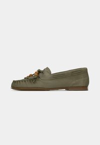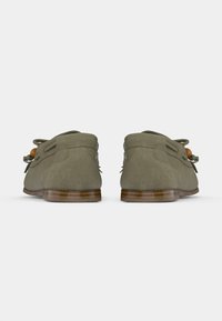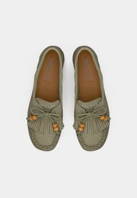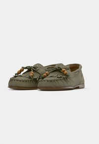 Mocassin vert olive avec détails en franges, perles décoratives et broderie. Dispose d'une semelle en cuir et de découpes latérales pour la respirabilité.