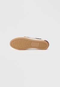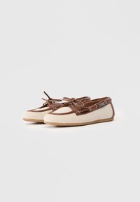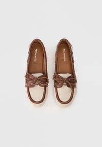 Chaussure bateau en cuir marron et toile beige avec un détail de nœud, bout arrondi, lacets latéraux et accents métalliques subtils. Semelle en caoutchouc à profil bas.