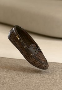 Chaussure bateau en cuir marron et textile tissé avec lacets et œillets dorés. Tige texturée et embout lisse.