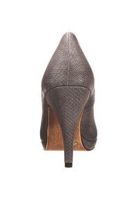Chaussure à talons hauts grise pour femmes avec un dessus texturé en motif serpent et un bout rond sur fond blanc.