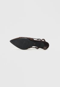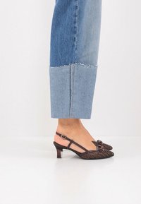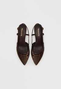Escarpin slingback tissé marron avec bout pointu, doté d'une boucle décorative, de fines brides et d'une hauteur de talon modérée.