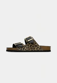 Sandales imprimé léopard avec deux brides noires et boucles dorées, dotées d'une semelle en liège et d'une semelle extérieure en caoutchouc noir texturé.