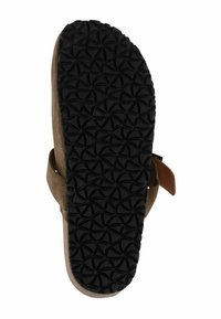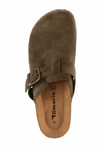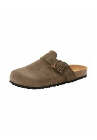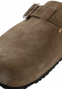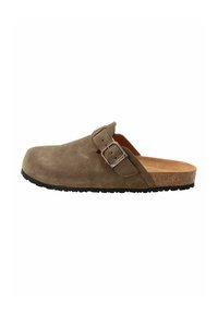 Sabots en daim marron avec un design à bride croisée, boucle réglable, et semelle en caoutchouc noire texturée, portés avec un pantalon vert olive.