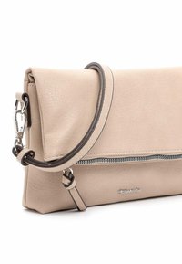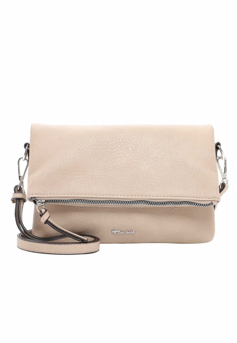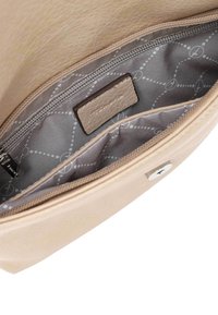 Sac bandoulière beige à rabat, avec fermeture éclair sur le devant, sangle amovible avec attaches métalliques et finition en cuir synthétique texturé.