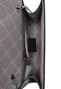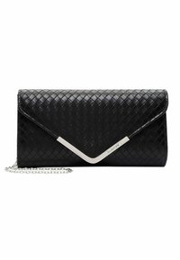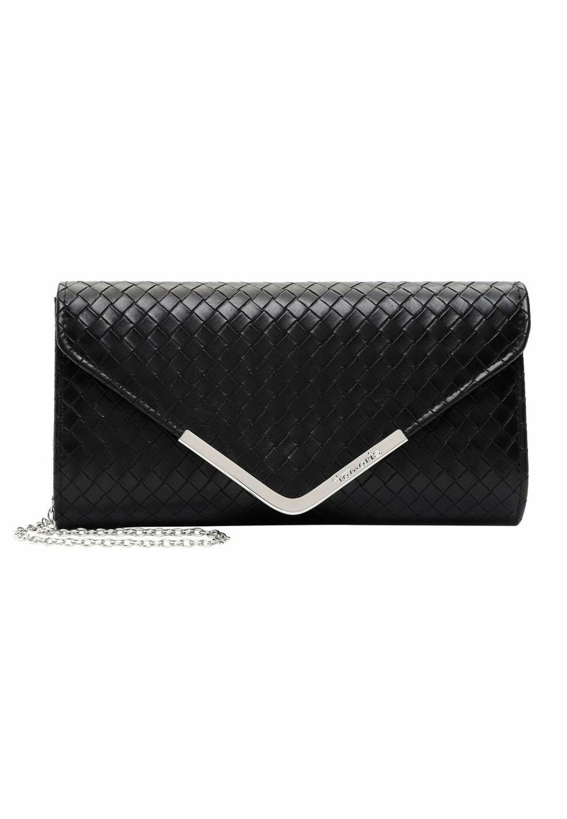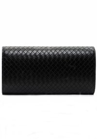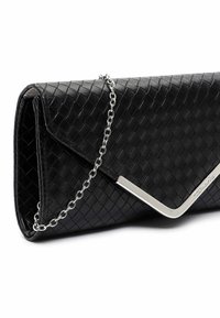 Pochette en cuir noir tressé avec détail métallique argenté en forme de V sur le rabat et une bandoulière en chaîne argentée partiellement visible.