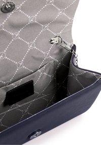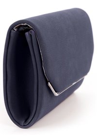 Pochette en simili cuir bleu marine avec une finition texturée, accents en métal argenté élégant et une bandoulière chaîne amovible. Elle dispose d'une fermeture à rabat.