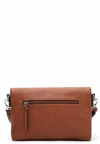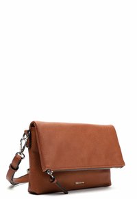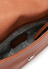 Sac en cuir marron à bandoulière avec un rabat, fermeture éclair et sangle détachable. Il présente une finition texturée et un détail de logo subtil.