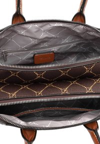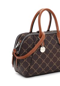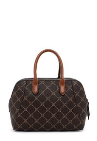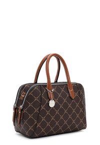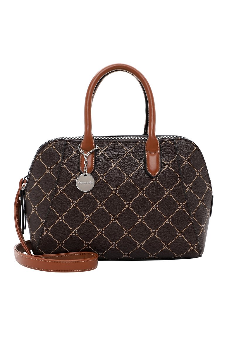 Sac à main marron avec des poignées et une sangle beige, arborant un motif en diamant orné de petits logos et une étiquette métallique ronde suspendue à une des poignées.