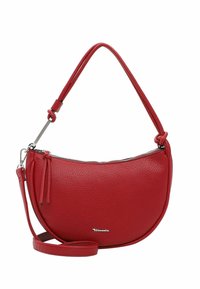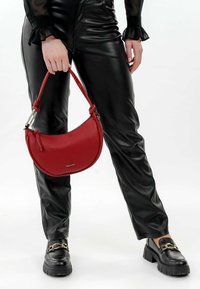 Sac à main en cuir rouge de forme incurvée, avec une surface texturée et une bandoulière courte. Il présente des accents métalliques et des détails aux extrémités de la bandoulière.