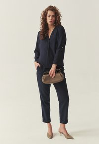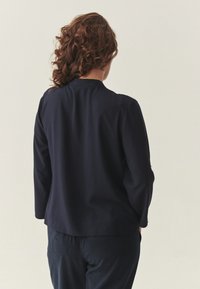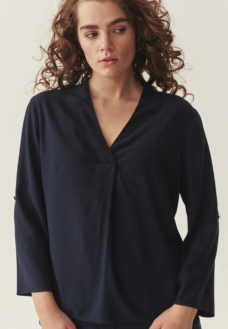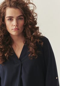 Femme aux cheveux bouclés portant un chemisier bleu marine à col en V et manches longues, regardant légèrement vers sa gauche sur un fond uni.