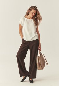 Femme portant un chemisier blanc ample à manches courtes avec un pantalon marron, posant avec une main dans la poche devant un fond clair uni.