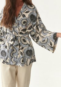 Kimono à motif floral en crème avec des fleurs bleues, noires et blanches. Comprend des manches larges et une ceinture nouée à la taille. Tissu doux.