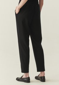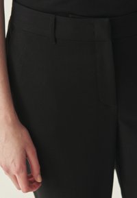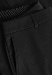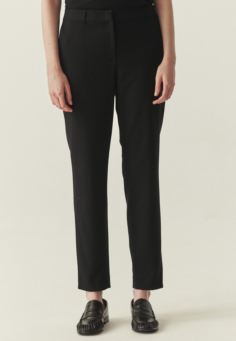 Pantalon noir sur mesure à coupe ajustée, devant plat et passants pour ceinture. Tissu lisse avec plis discrets, associé à des mocassins noirs.