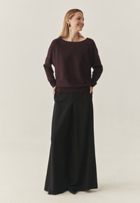 Pull bordeaux avec un large décolleté, manches longues et poignets côtelés, associé à un pantalon noir ample. Texture lisse.