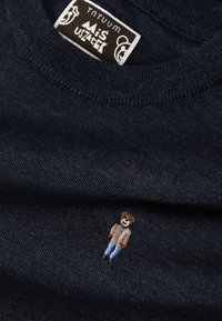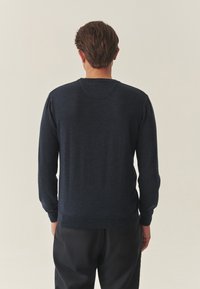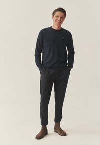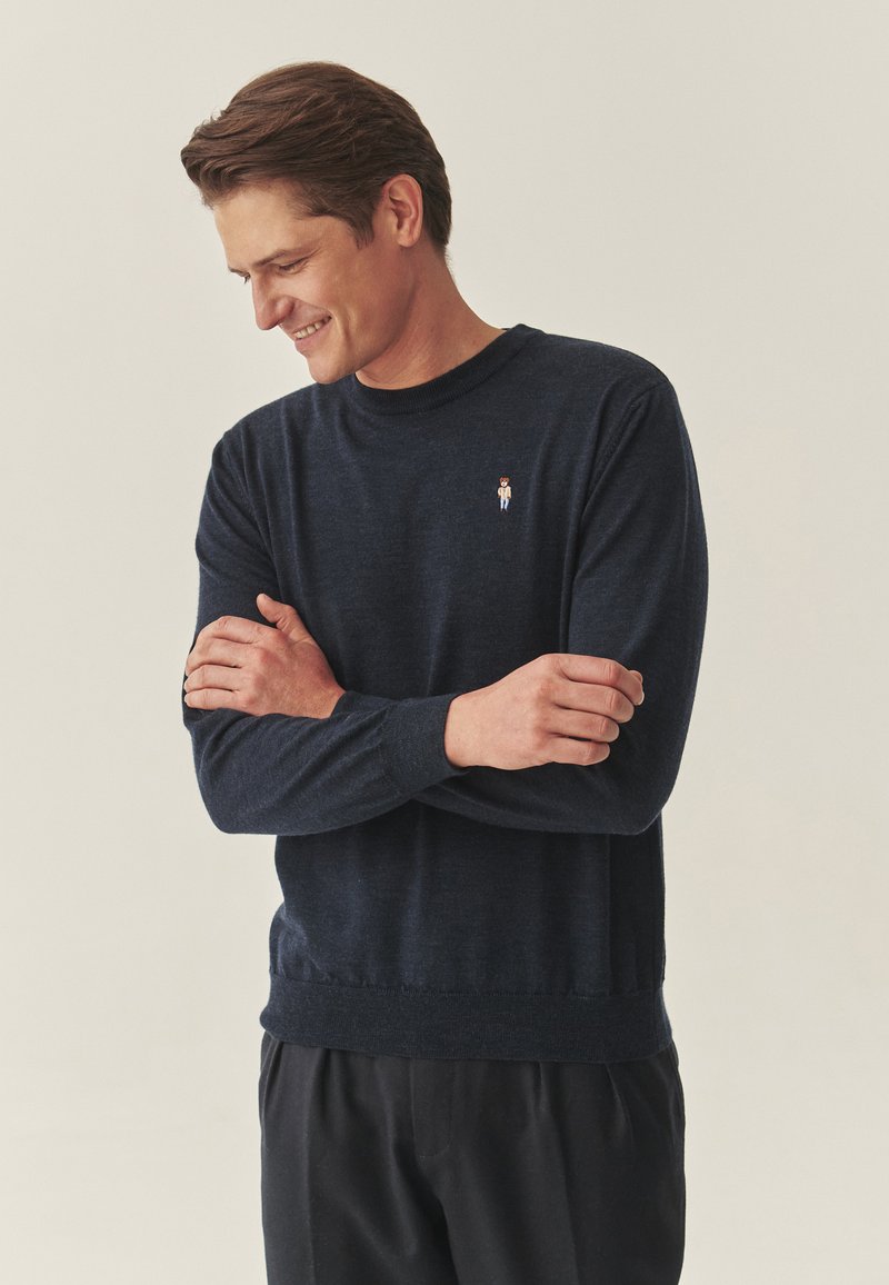 Pull à manches longues bleu marine en maille douce avec un col et des poignets côtelés, orné d'un petit logo brodé sur la poitrine.