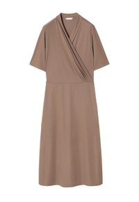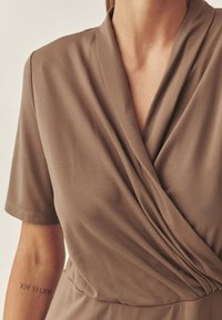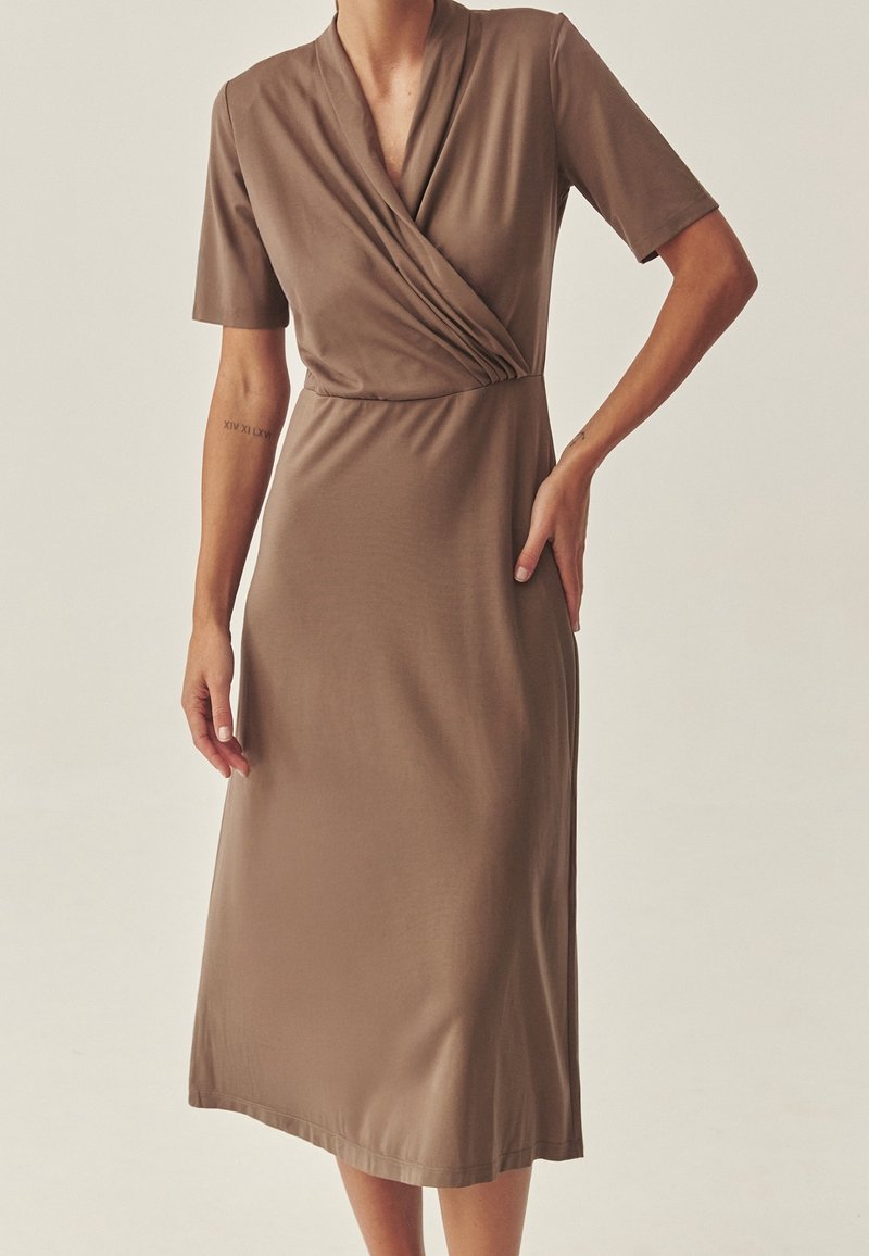 Robe portefeuille marron à manches courtes, décolleté en V et taille cintrée. Tissu lisse, longueur genoux, avec un drapé subtil à l'avant.