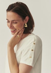 T-shirt blanc à manches courtes avec un col rond, agrémenté de boutons dorés sur les épaules. Tissu lisse et coupe décontractée.
