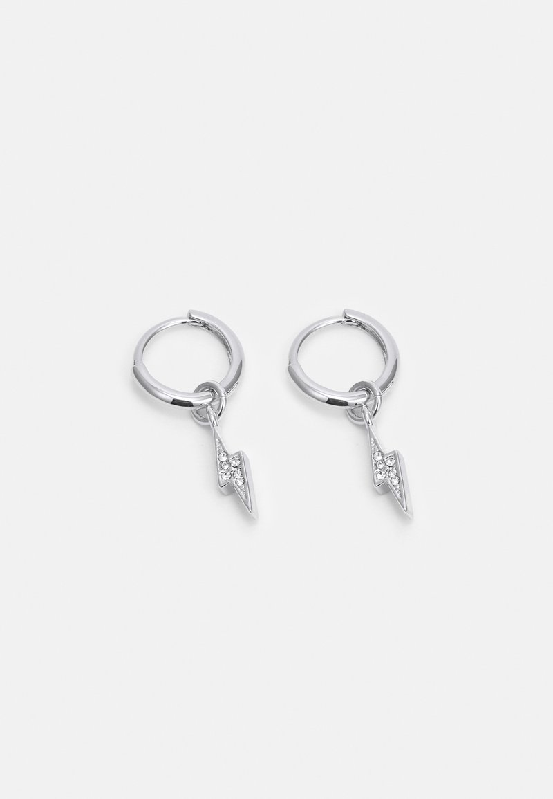 Boucles d'oreilles en argent en forme de créoles avec de petits pendentifs éclairs ornés de strass transparents sur un fond blanc uni.