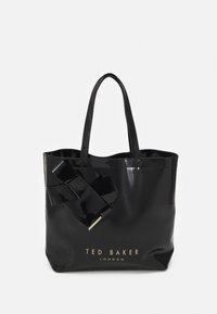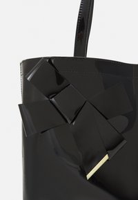 Femme en blouse bleue et jean large tenant un sac fourre-tout Ted Baker en cuir verni noir, portant des mules à talons noires contre un mur en béton.