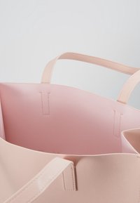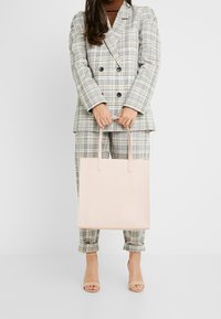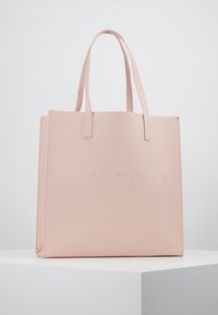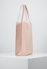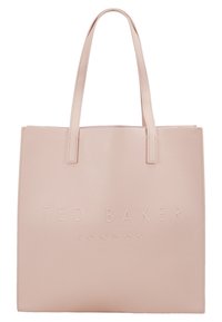 Sac fourre-tout en cuir synthétique rose avec logo embossé "TED BAKER LONDON", forme rectangulaire et poignées plates cousues. Texture lisse, design minimaliste.
