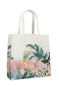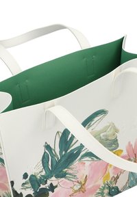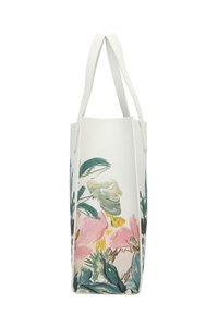 Sac fourre-tout blanc avec un motif floral aux accents rose, vert et bleu. Texture lisse avec deux bretelles solides pour l'épaule.