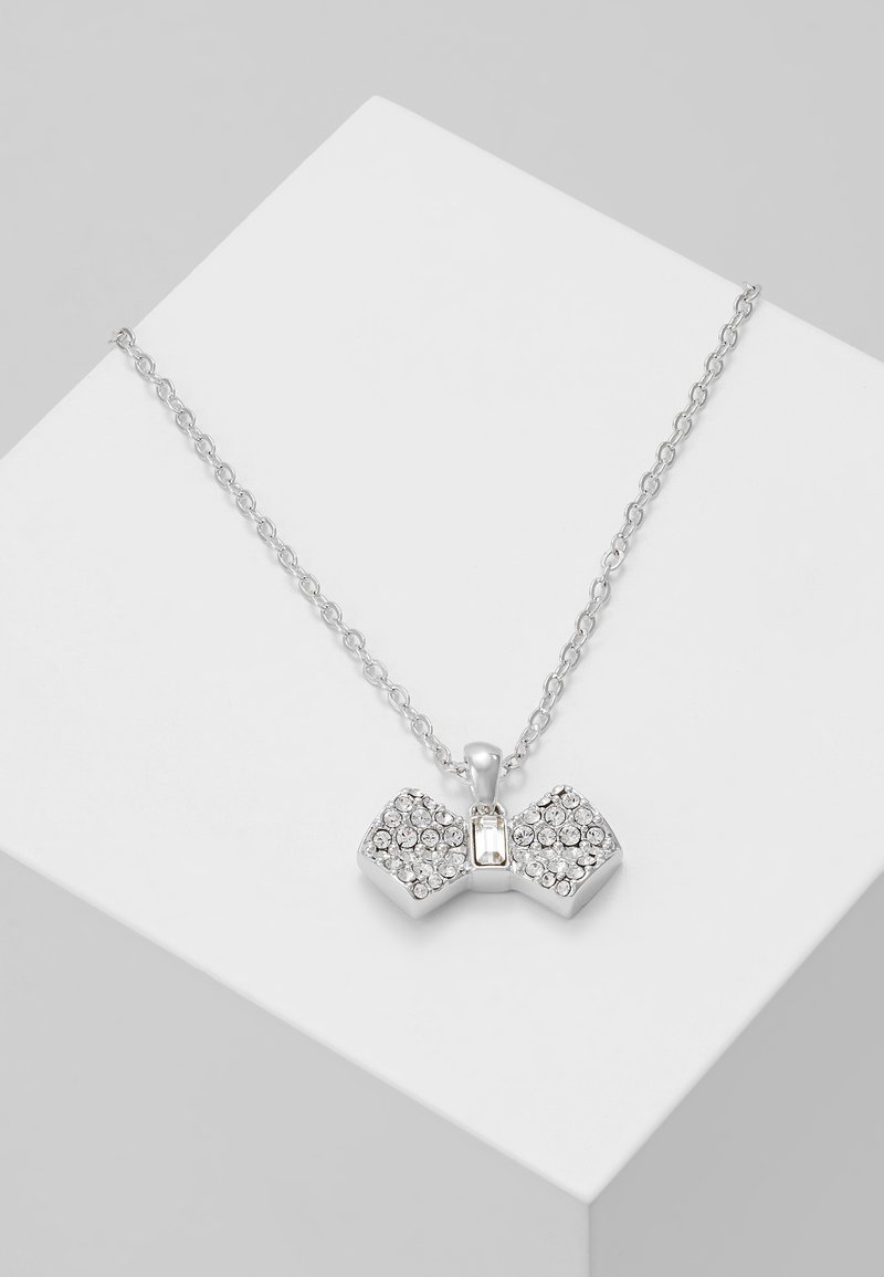 Collier en chaîne argentée avec un pendentif en forme de nœud orné de cristaux clairs ronds et rectangulaires, présenté sur une plateforme blanche.