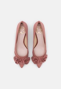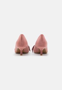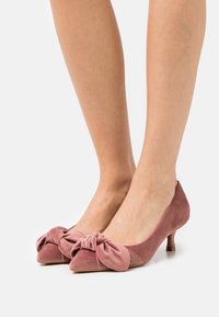 Chaussures à talons hauts en daim rose avec un bout pointu et un grand nœud à l'avant, présentant un talon fin et bas.