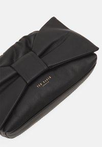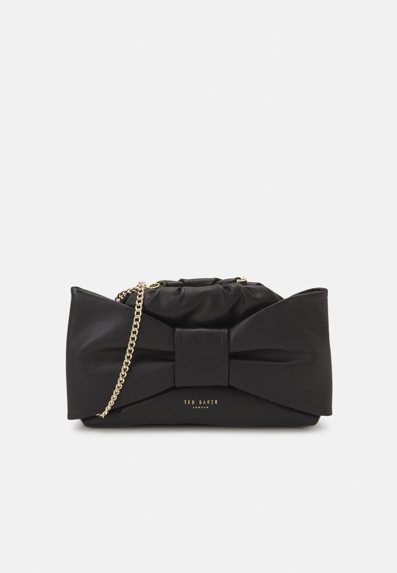 Sac à main en cuir noir avec un grand nœud décoratif, un dessus froncé, une bandoulière en chaîne et des accents en métal doré. Logo "Ted Baker London" sur le devant.