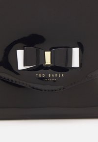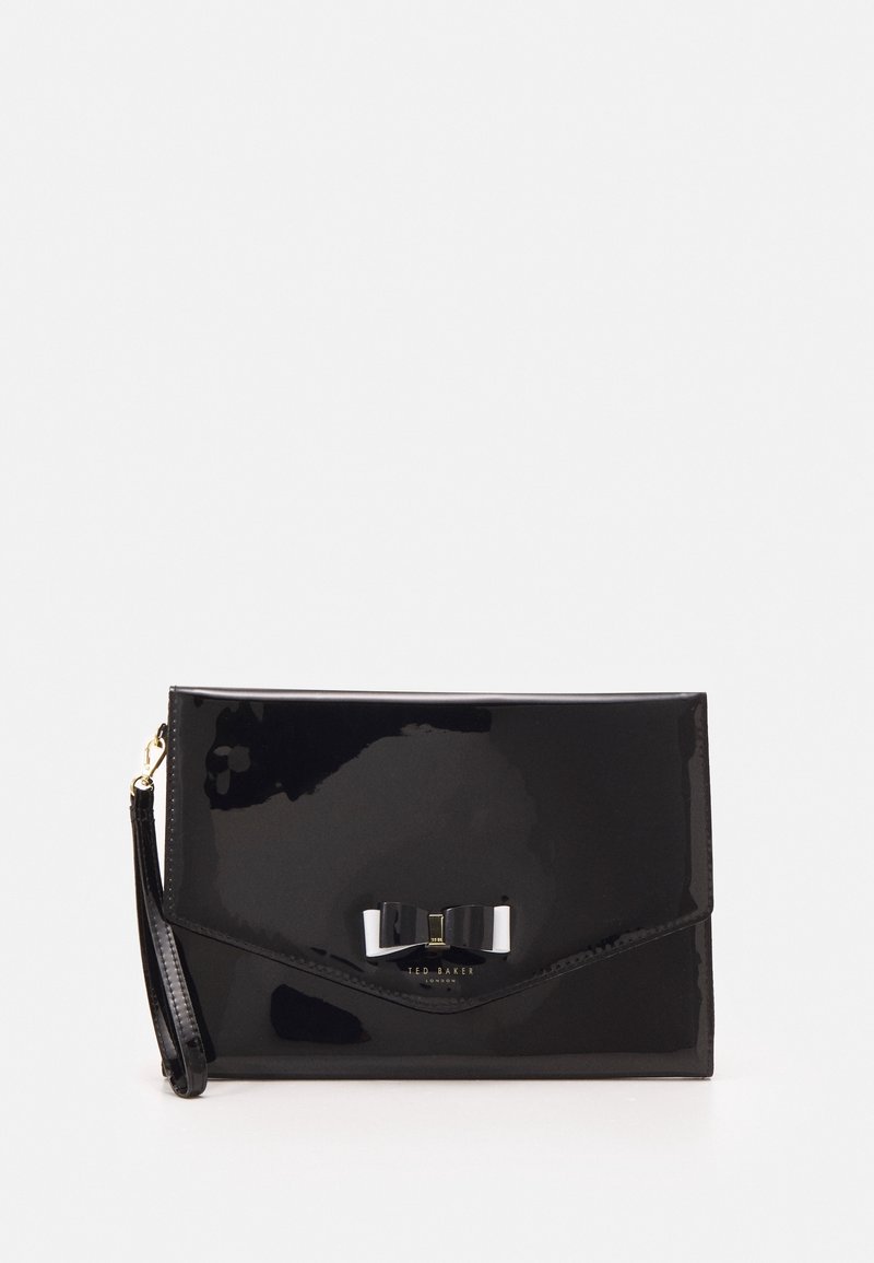 Pochette en cuir verni noir avec un nœud décoratif, ornée d'un logo en métal doré. Texture lisse avec un design élégant et plié.