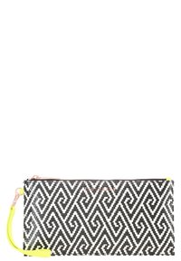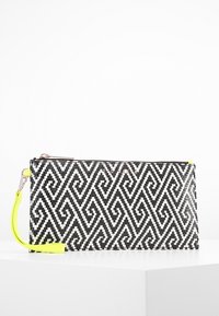 Pochette à motif géométrique en noir et blanc avec une texture lisse, équipée d'une sangle de poignet jaune néon et d'une ferrure argentée.