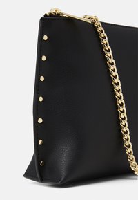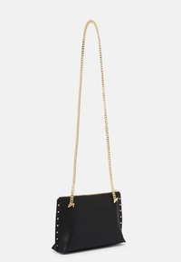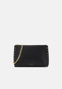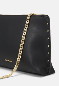 Pochette rectangulaire noire avec des clous dorés sur les côtés, une chaîne dorée en bandoulière, et un petit logo "TED BAKER" au centre à l'avant.