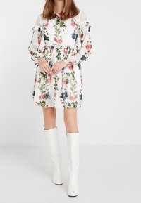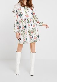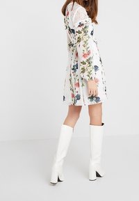 Femme portant une robe blanche à motifs floraux avec des épaules en dentelle et des manches longues, assortie à des bottes blanches en vinyle montant jusqu'aux genoux.