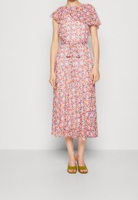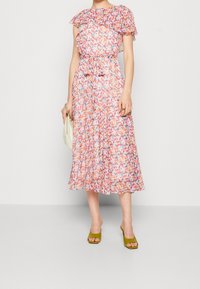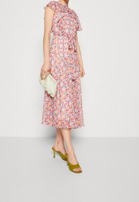 Femme portant une robe midi fleurie multicolore avec manches bouffantes et ceinture à la taille, associée à des talons ouverts vert olive, debout devant un fond uni.
