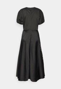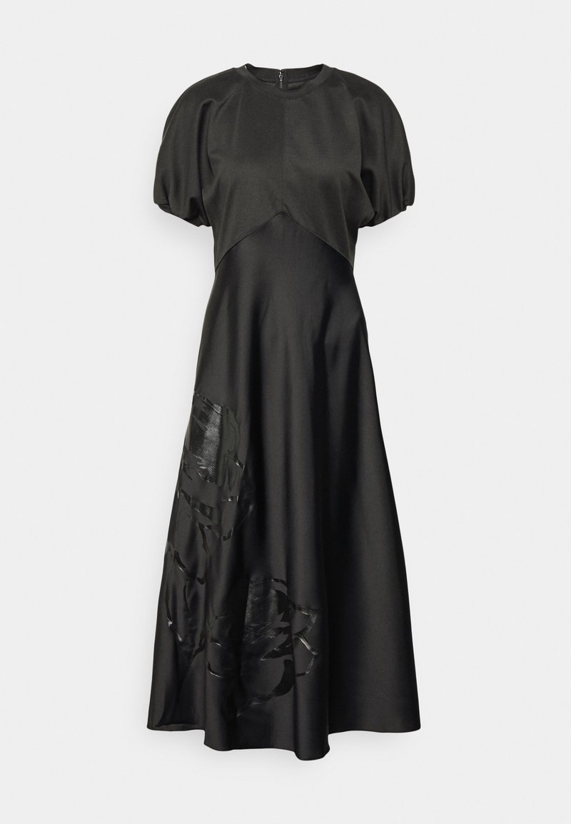Robe noire avec un corsage ajusté et des manches bouffantes. Une jupe fluide présente des motifs floraux subtils en couches et une fermeture éclair au dos.