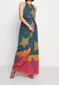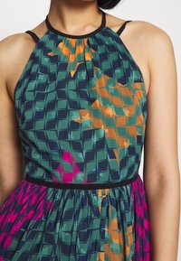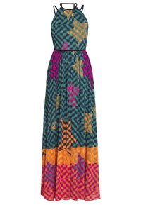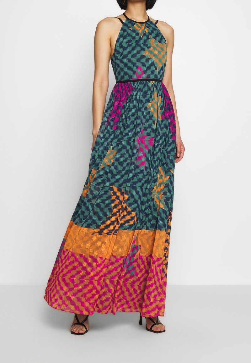 Robe longue à col licou, arborant un motif géométrique en bleu sarcelle, orange et rose. Tissu léger avec une silhouette fluide.
