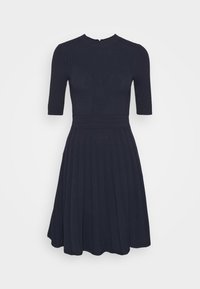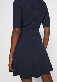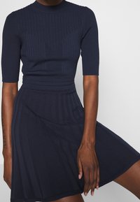 Femme portant une robe en maille côtelée bleu marine à manches courtes et taille cintrée, debout devant un fond uni.
