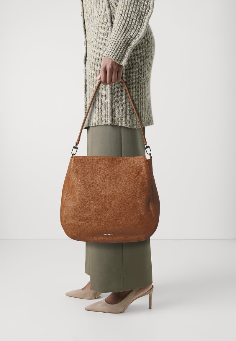 Sac fourre-tout en cuir marron avec une texture douce et une forme arrondie, doté d'une bandoulière amovible. Porté avec un pull gris clair et un pantalon vert.