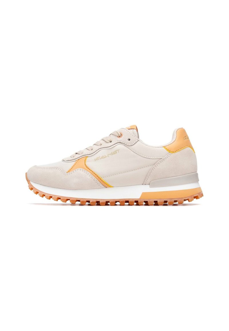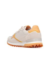Chaussures de course beiges en cuir et daim, avec des accents jaunes, une semelle texturée orange et des lacets ronds. Le design est athlétique.