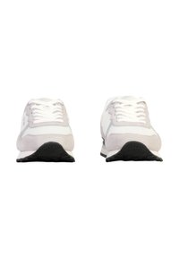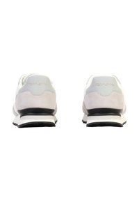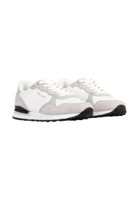 Baskets basses blanches et gris clair avec des lacets blancs, une semelle en caoutchouc, et un texte doré sur le côté, montrées en profil droit sur fond blanc.