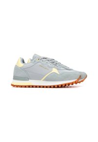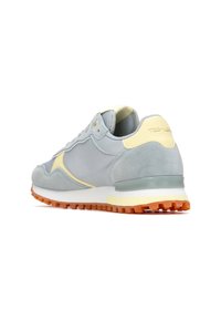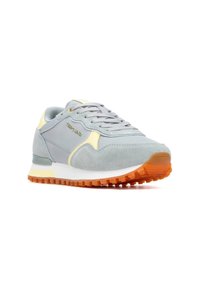 Baskets en daim gris et mesh avec accents jaunes, semelle extérieure en caoutchouc et semelle à texture. Caractéristiques : bout arrondi et fermeture à lacets.