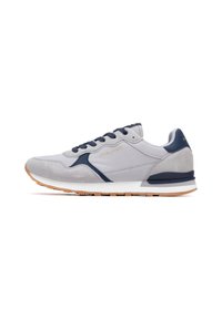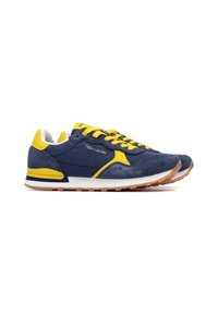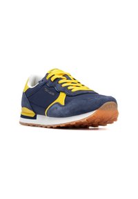 Baskets bleu marine avec accents et lacets jaunes, en suède et matériaux synthétiques, forme incurvée, semelle blanche et logo de marque.