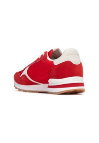 Baskets de sport rouges avec dessus en daim et mesh, accents blancs, design à lacets, et semelle extérieure en caoutchouc texturée. Présentent un logo doré sur le côté.