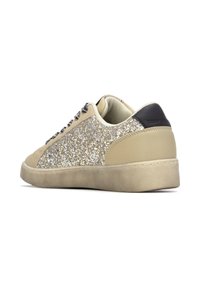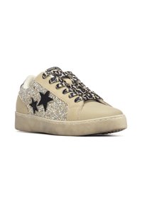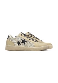 Baskets beige avec partie supérieure scintillante or et argent, ornées d'accents d'étoiles noires et de lacets ronds. Semelle épaisse en caoutchouc pour un bon maintien.